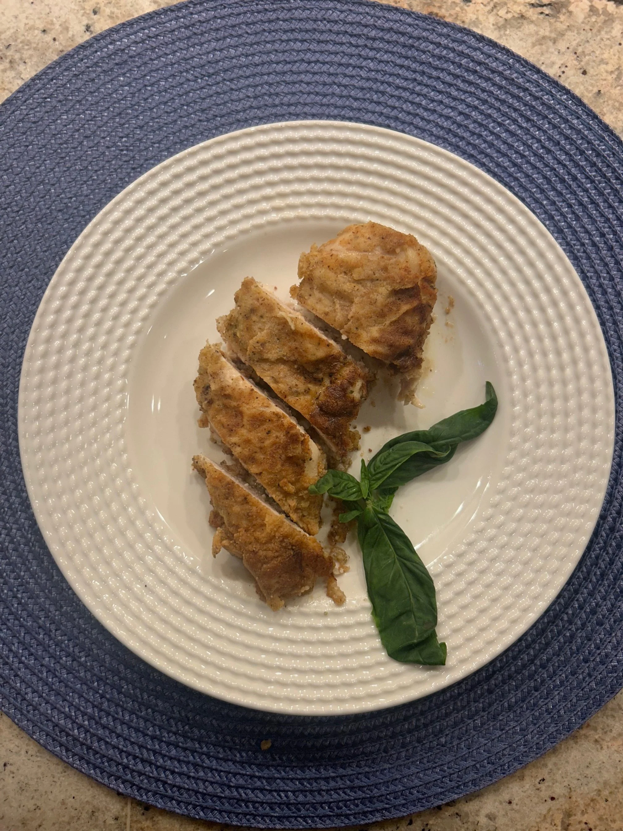 Take each marinated chicken breast and dredge it in the almond flour mixture, ensuring an even coating.