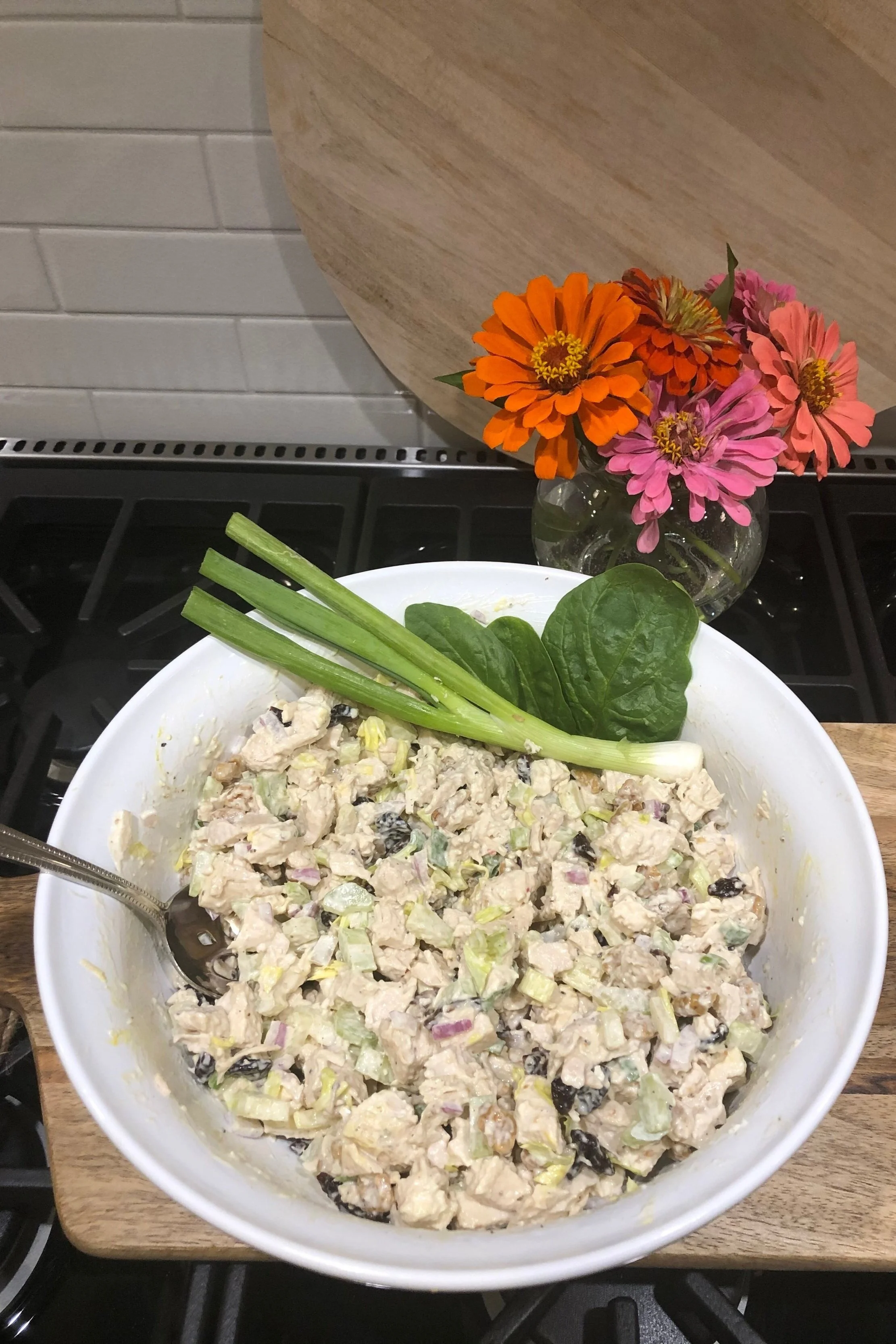 Simmer on low in 1 cup of bone broth till meat turns white. (Do not overcook) Set aside and cool while chopping 1 cup of celery including the center leaves with all the flavor, the onions, and walnuts, and Dried cherries.